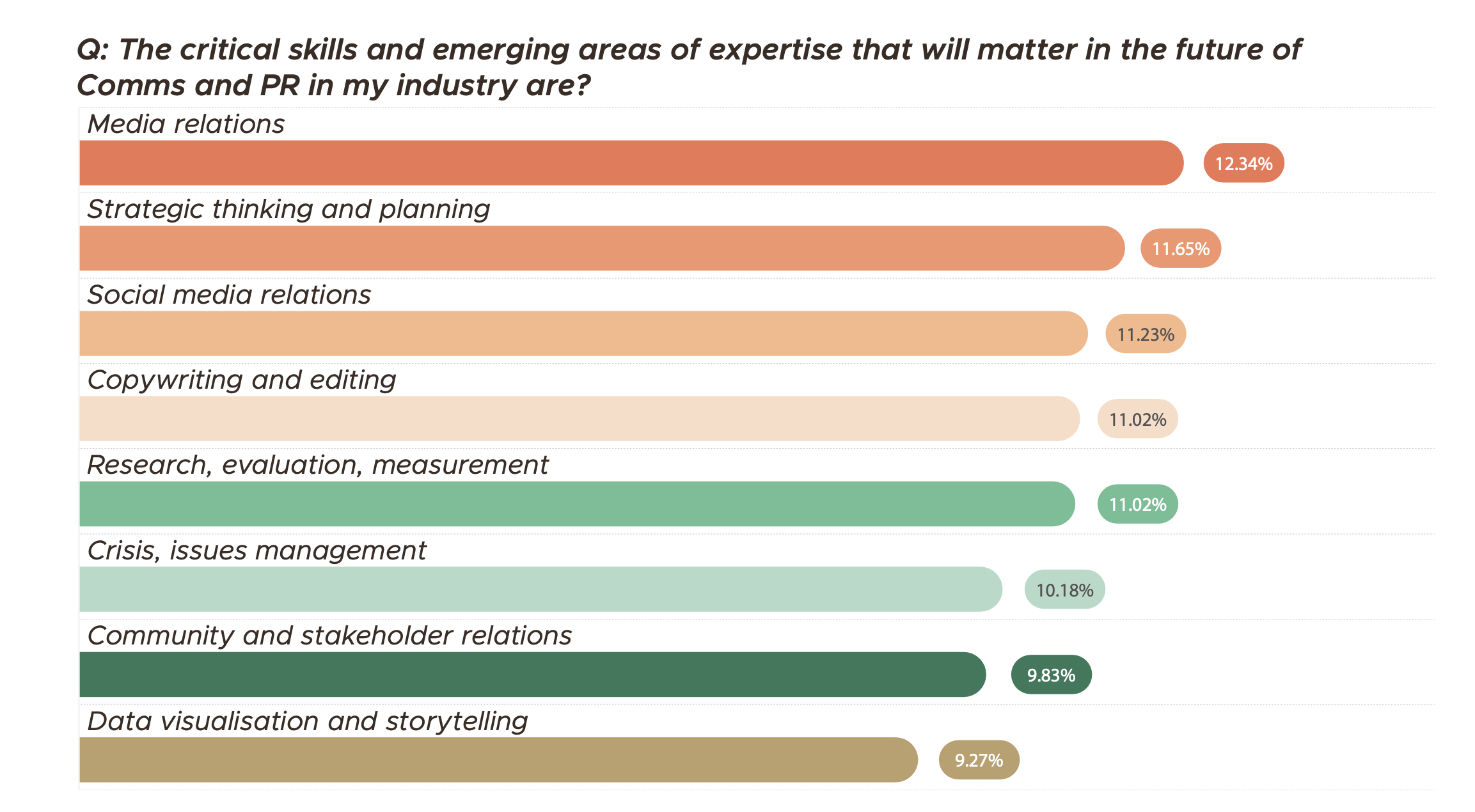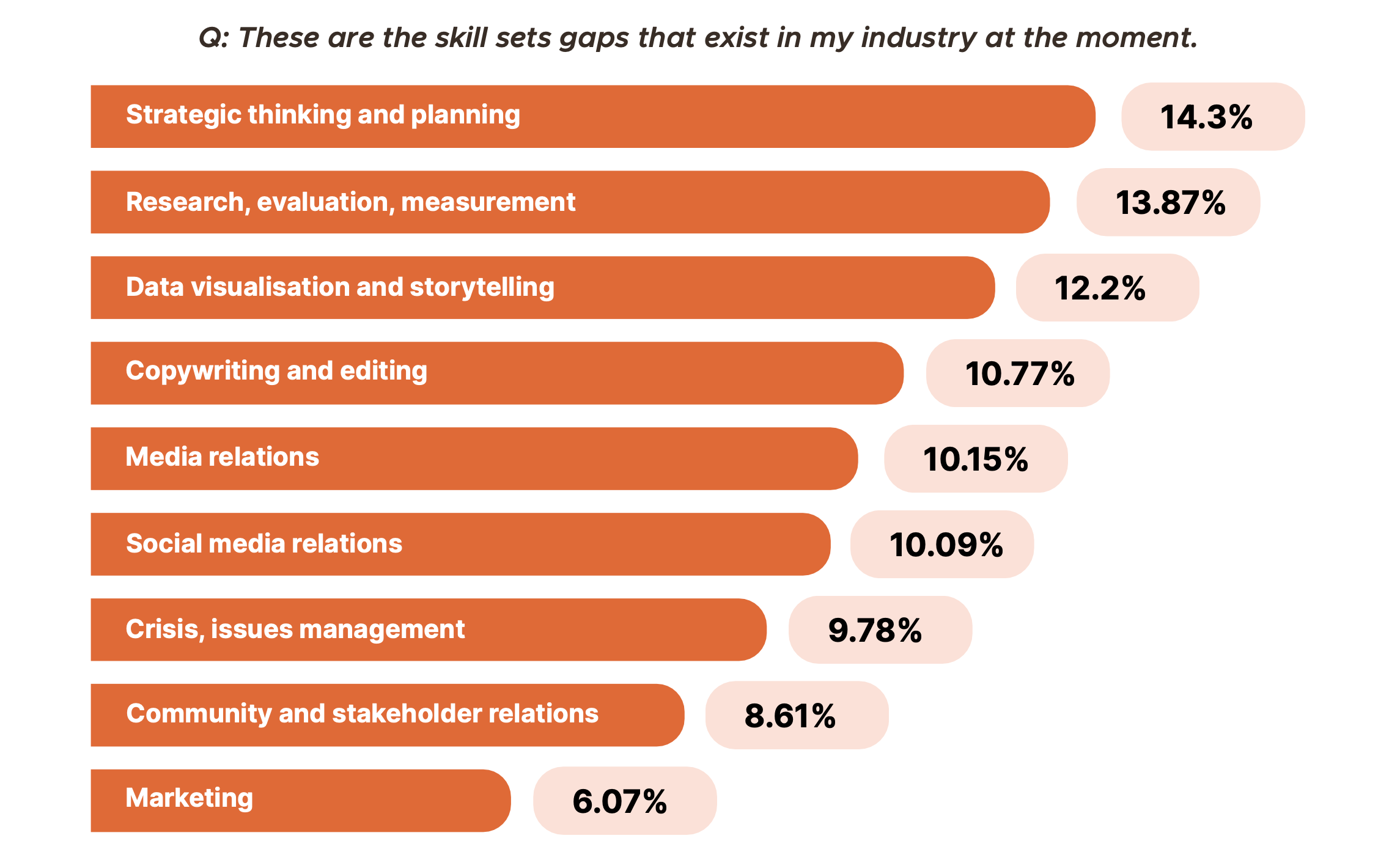 The APCR states that, “Practitioners are facing a skills gap. The largest gaps identified are in strategic thinking and planning, data visualisation and storytelling, research, evaluation and measurement and copywriting and editing.”