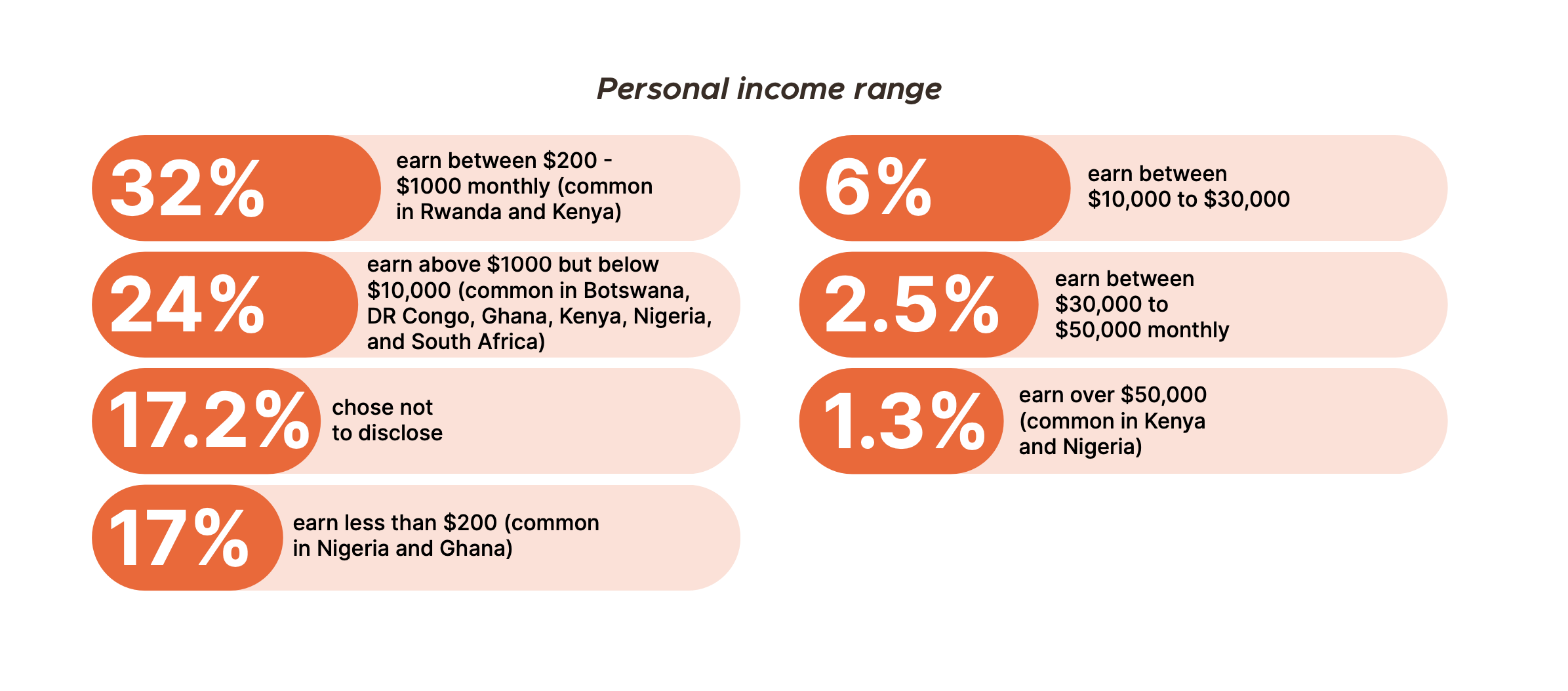 “A significant majority (73%) of industry professionals earn less than $10,000 per month–-17% earn less than $200; this was common in countries like Nigeria and Ghana. A third (32%) of the professionals earn between $200 – $1000 monthly, as seen in Rwanda and Kenya. Another 24% earned above $1000 but below $10,000 as monthly income, as was the case in Botswana, DR Congo, Ghana, Kenya, Nigeria, and South Africa.